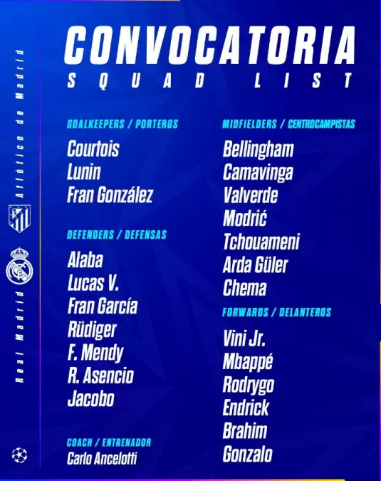 Defans: Alaba, Lucas V., Fran García, Rüdiger, Mendy, Asencio, Jacobo.