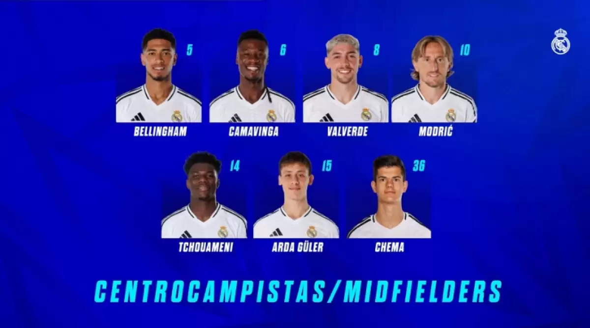 Orta saha: Bellingham, Camavinga, Valverde, Modrić, Tchouameni, Arda Güler, Chema.
